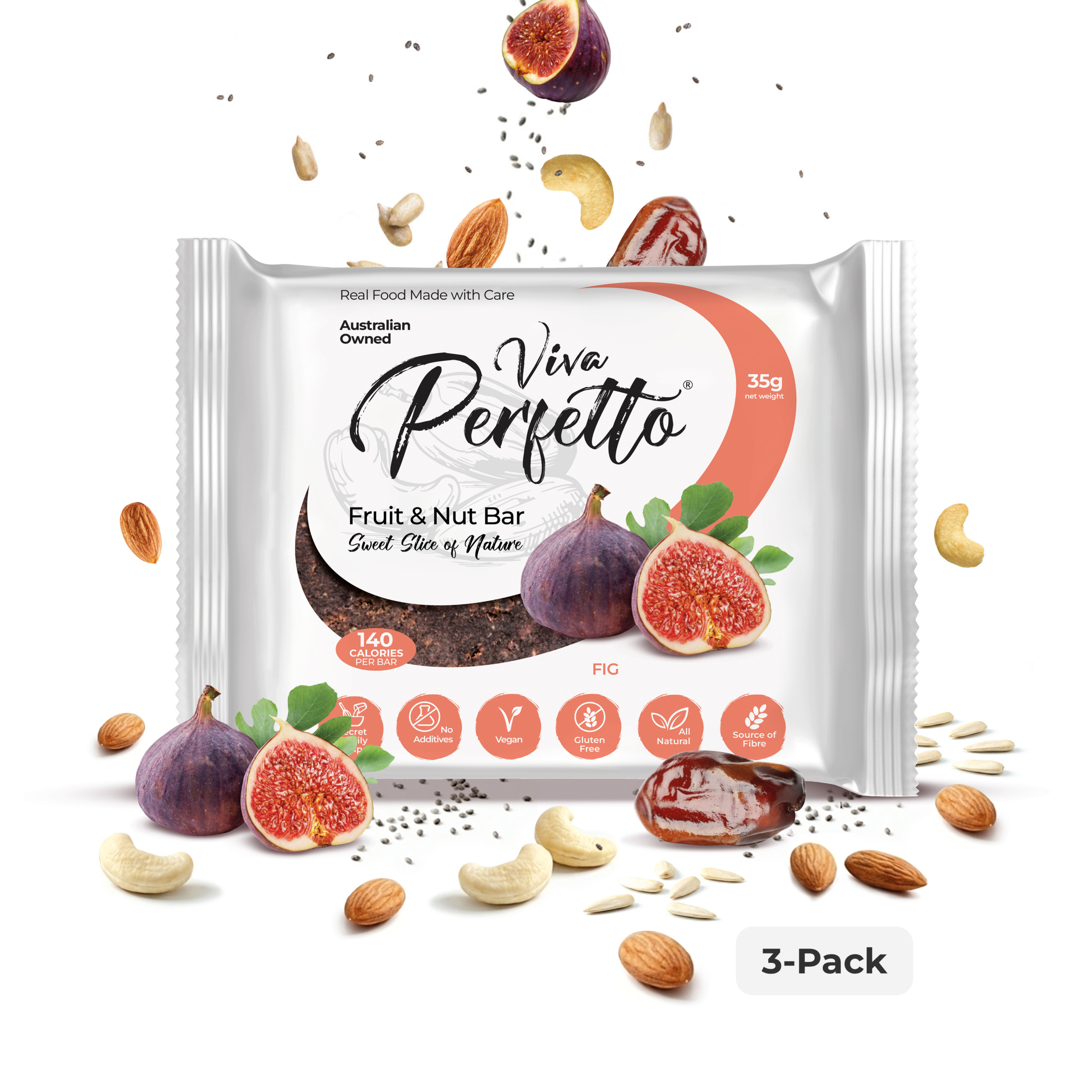Soft figs paired with sweet dates and superfood seeds for a natural fruity chew, with the crunchy richness of whole roasted almonds and cashews.